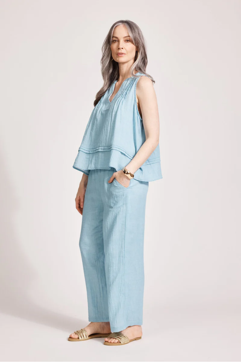 A breezy, lightweight tank made for easy warm-weather dressing. The soft Nimbus shade keeps it fresh and versatile, while the relaxed fit makes it perfect with shorts, linen pants, or layered under a cape or jacket.