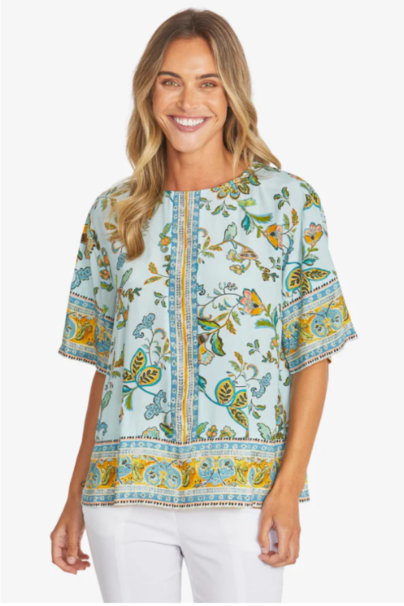 Breezy and full of charm, the Colette Top features a relaxed silhouette and soft, drapey fabric with a summery boho‑inspired border print, making it perfect for warm days. Its round neckline and elbow‑length sleeves offer effortless style that pairs beautifully with denim, linen pants, or a floaty skirt.