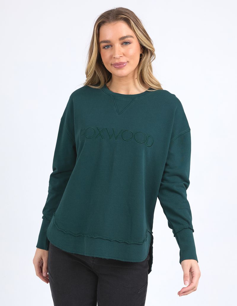 A classic round neckline meets a curved hi-lo hem with raw edging, while signature Foxwood embroidery anchors the look with quiet brand identity. Designed for effortless pairing with denim, leggings, or lounge pants, it brings ease and shape to off-duty dressing.