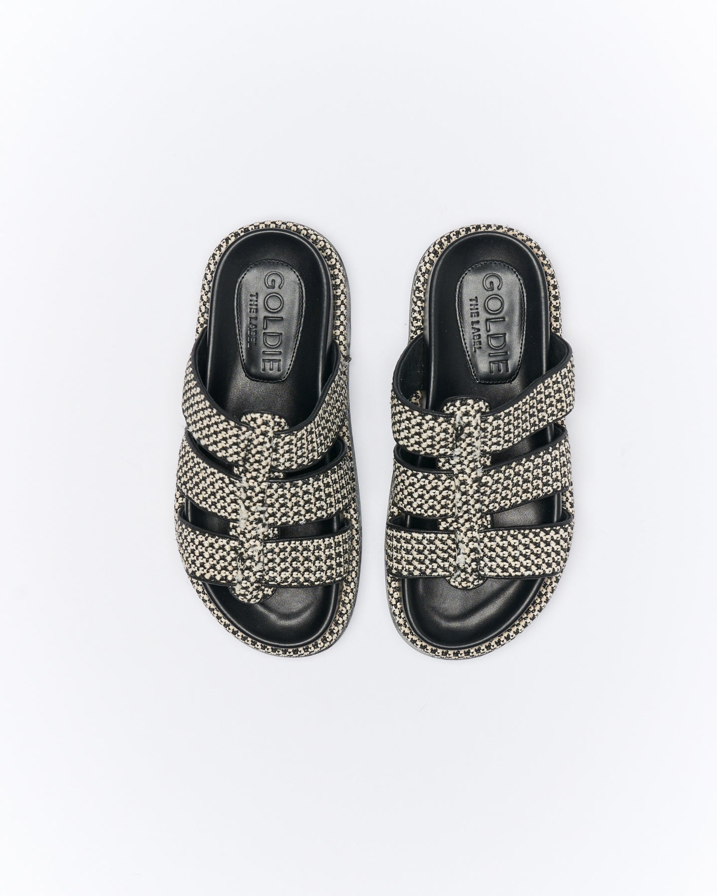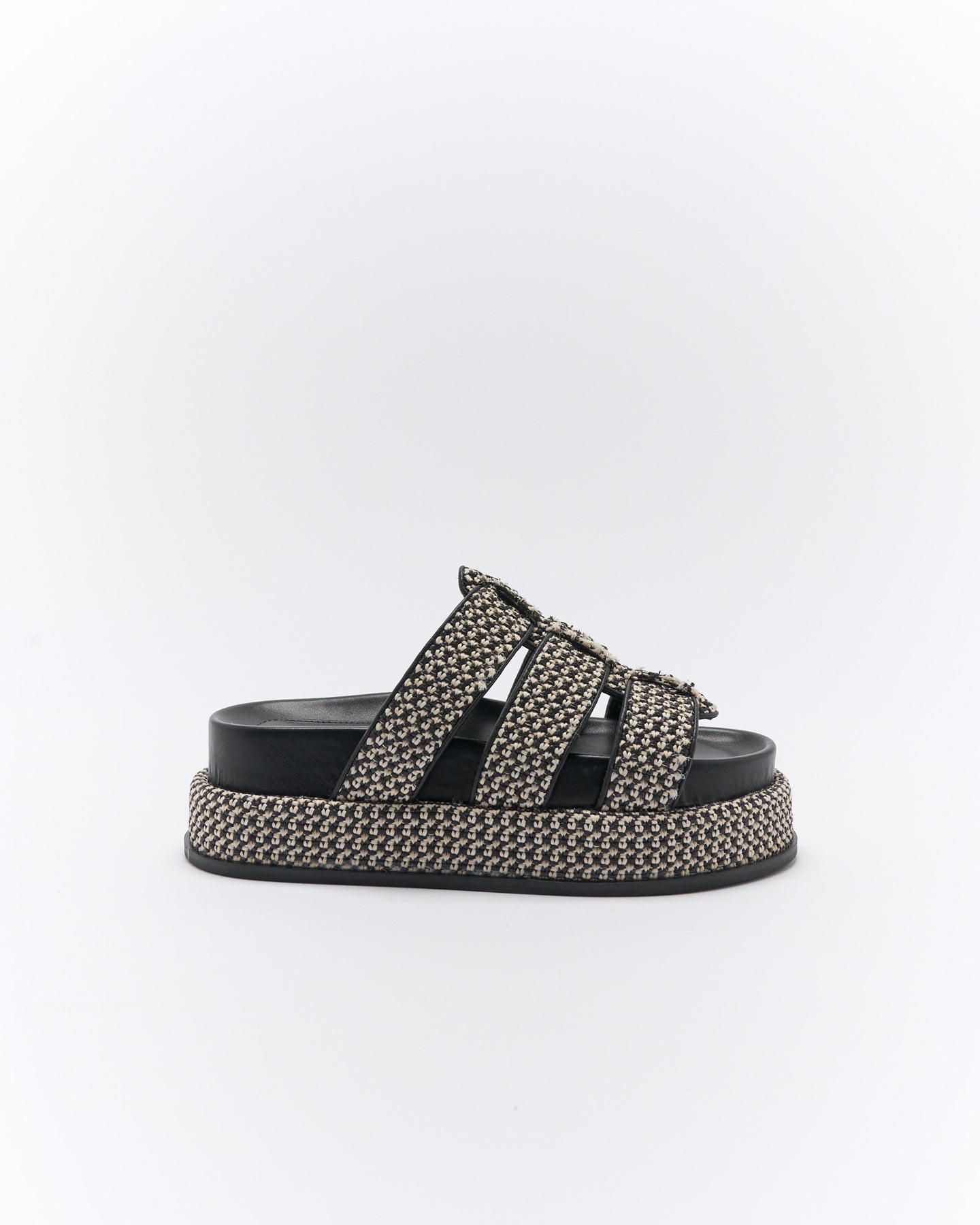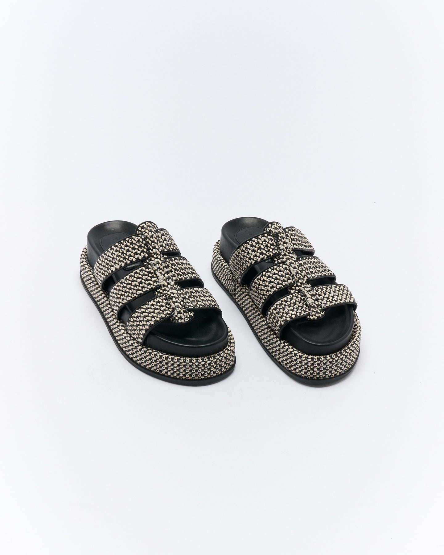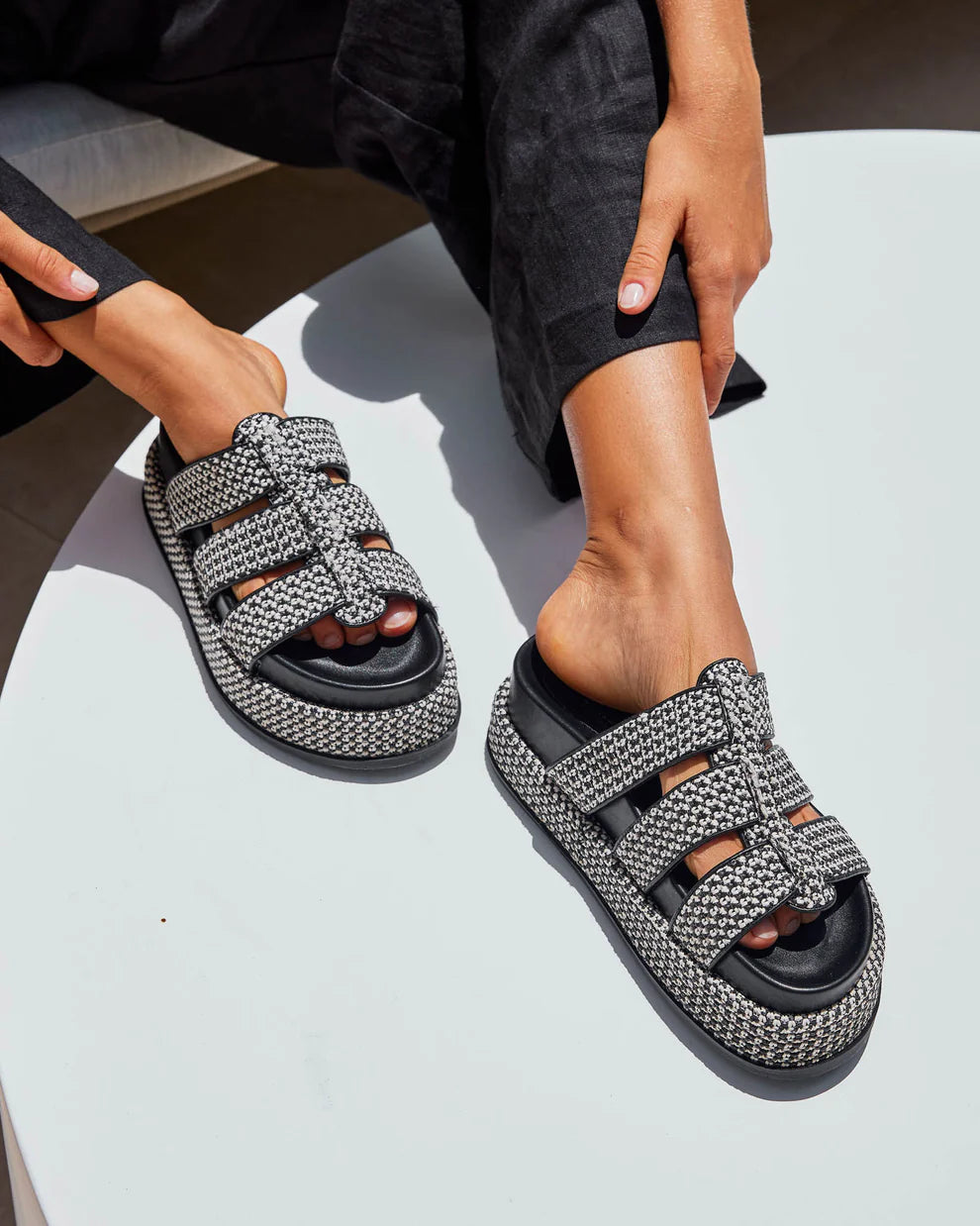 The Huxley Slide in black multi features a chunky platform sole wrapped in woven jute for a natural, textured finish. Triple straps offer structure and support, while the padded insole ensures comfort with every step.